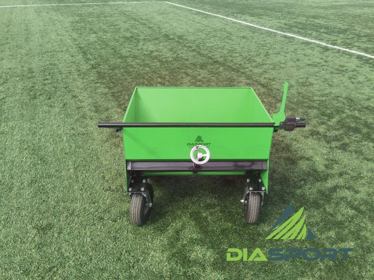 Главной особенностью данной модели является его способность трансформироваться из ручного агрегата в прицепной к садовому трактору или иному виду техники. Так же бункер имеет разворот 180о за счет пары поворотных независимых колес, это облегчает труд оператора и обеспечивает технику максимальной манёвренностью. Регулировка открытия заслонки позволяет контролировать объем высыпаемого содержимого, а отключаемый вал с лопастями, экономит содержимое, во время стоянки или движения к месту рассыпки. DiaSport E – 100 выполнен из стального корпуса 1,5мм, 4 пневматических газонных колеса, регулировку заслонки бункера при помощи винта, рукоятку размыкания привода вала с лопастями. Вся конструкция окрашена порошковой покраской, обеспечивая блеск и защиту от коррозии на весь срок службы техники.